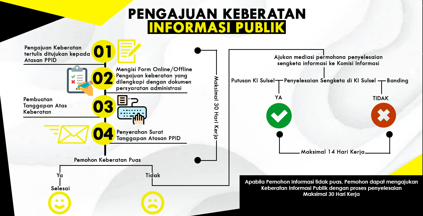 Apabila Pemohon Informasi tidak puas, Pemohon dapat mengajukan Keberatan Informasi Publik dengan proses penyelesaian Maksimal 30 Hari Kerja.